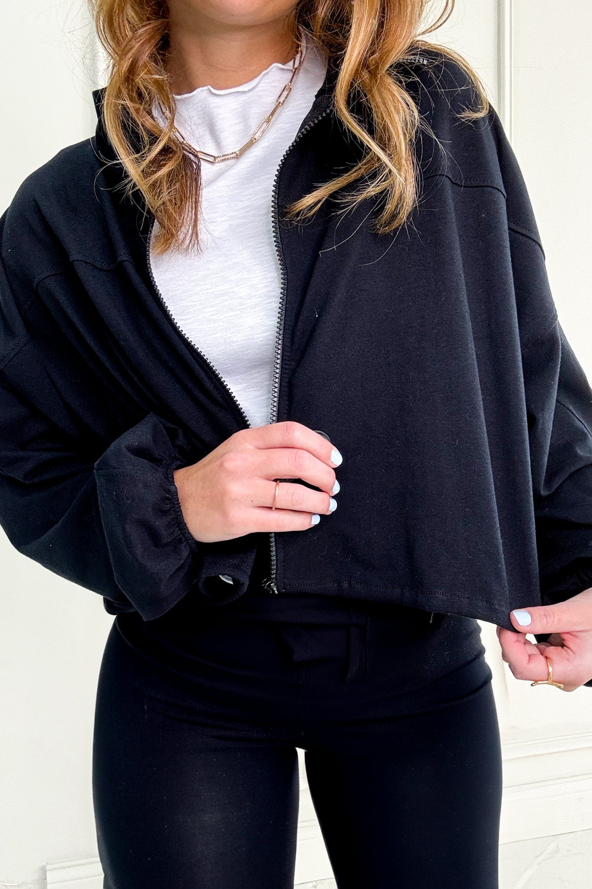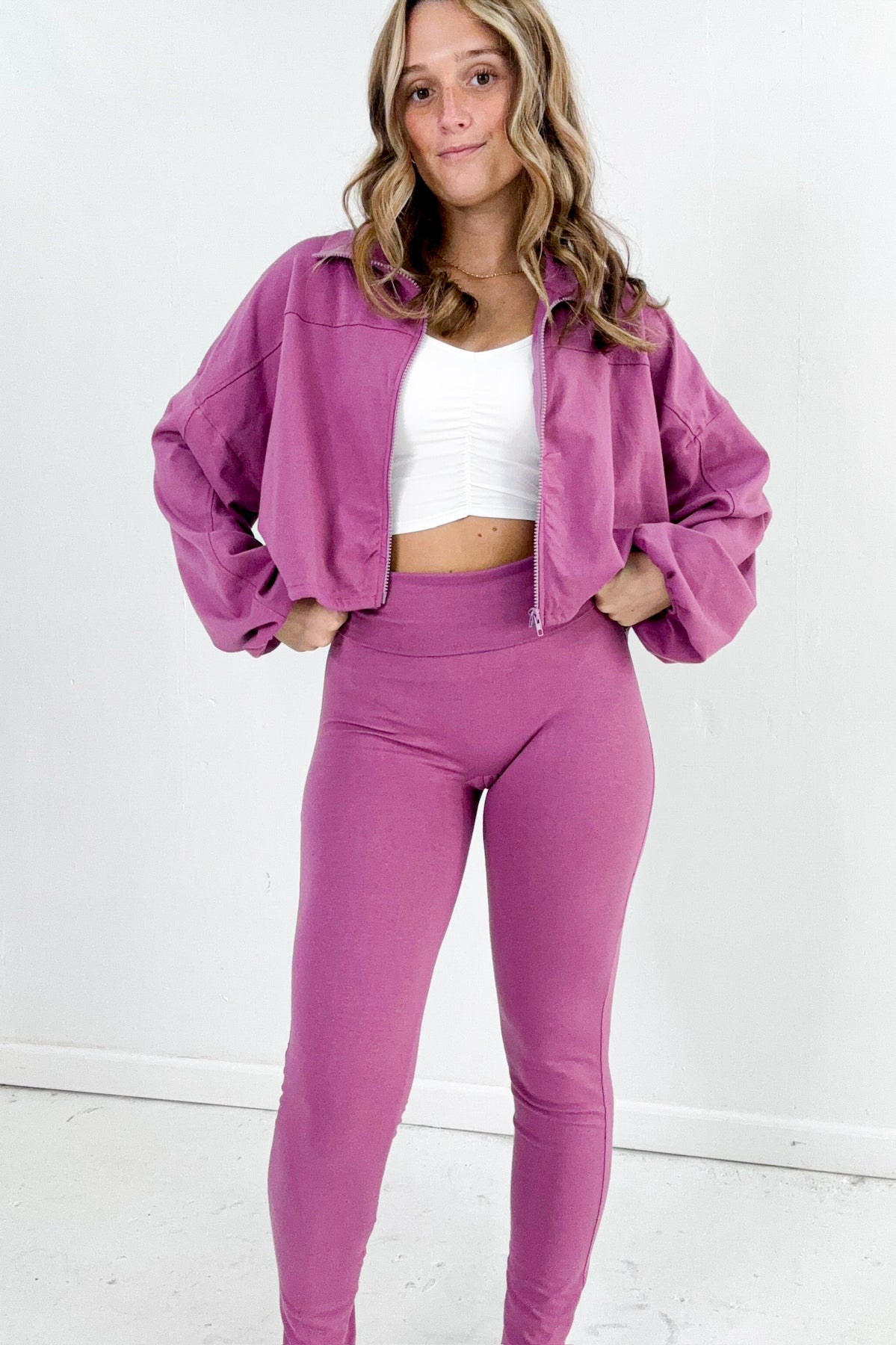 A lightweight zip jacket and wide-band leggings come together in this sleek set made for movement and errands alike. Comfy, cool, and ready for action.