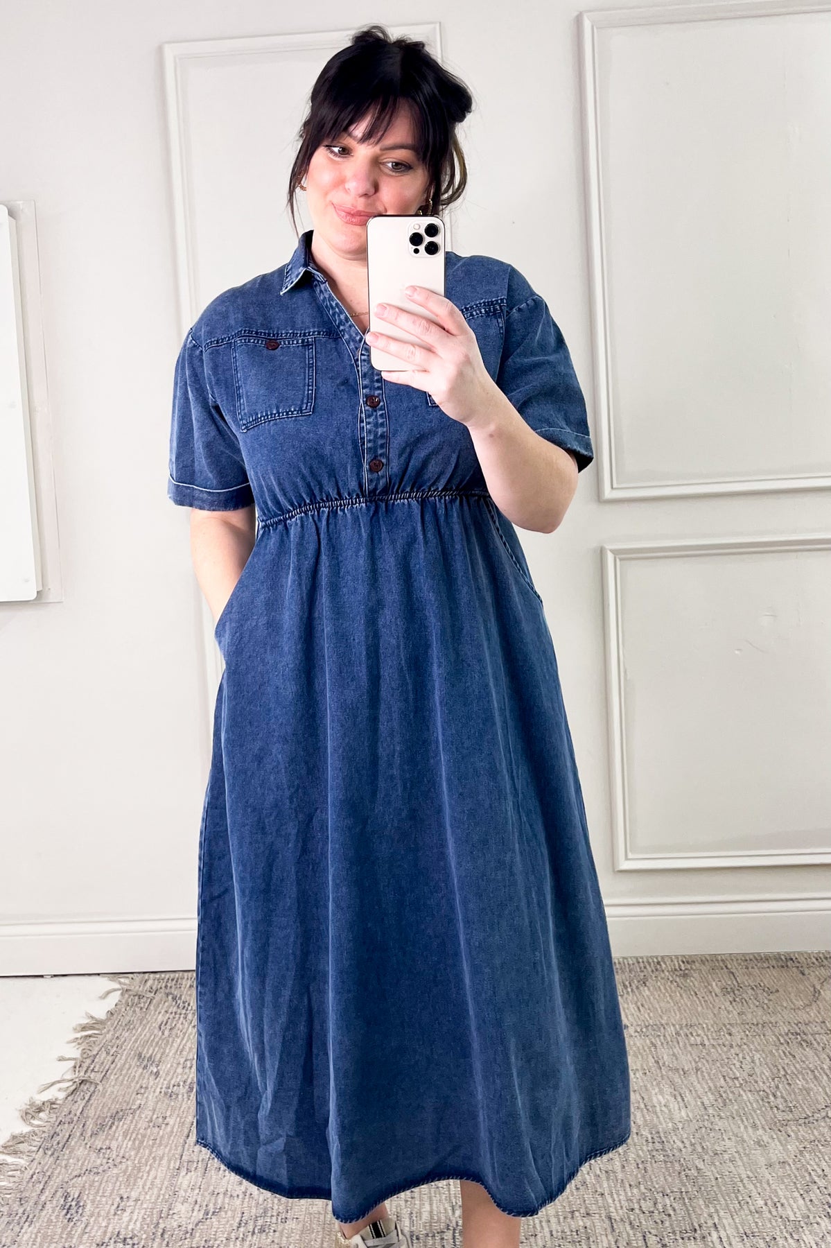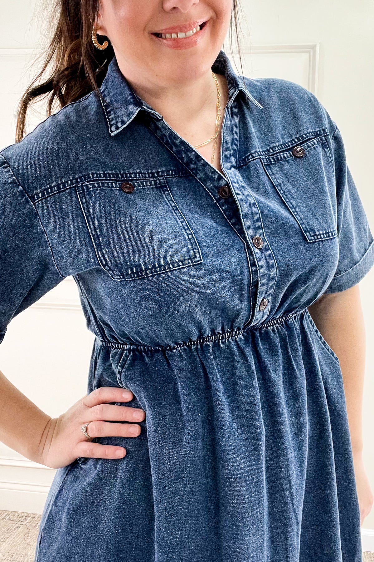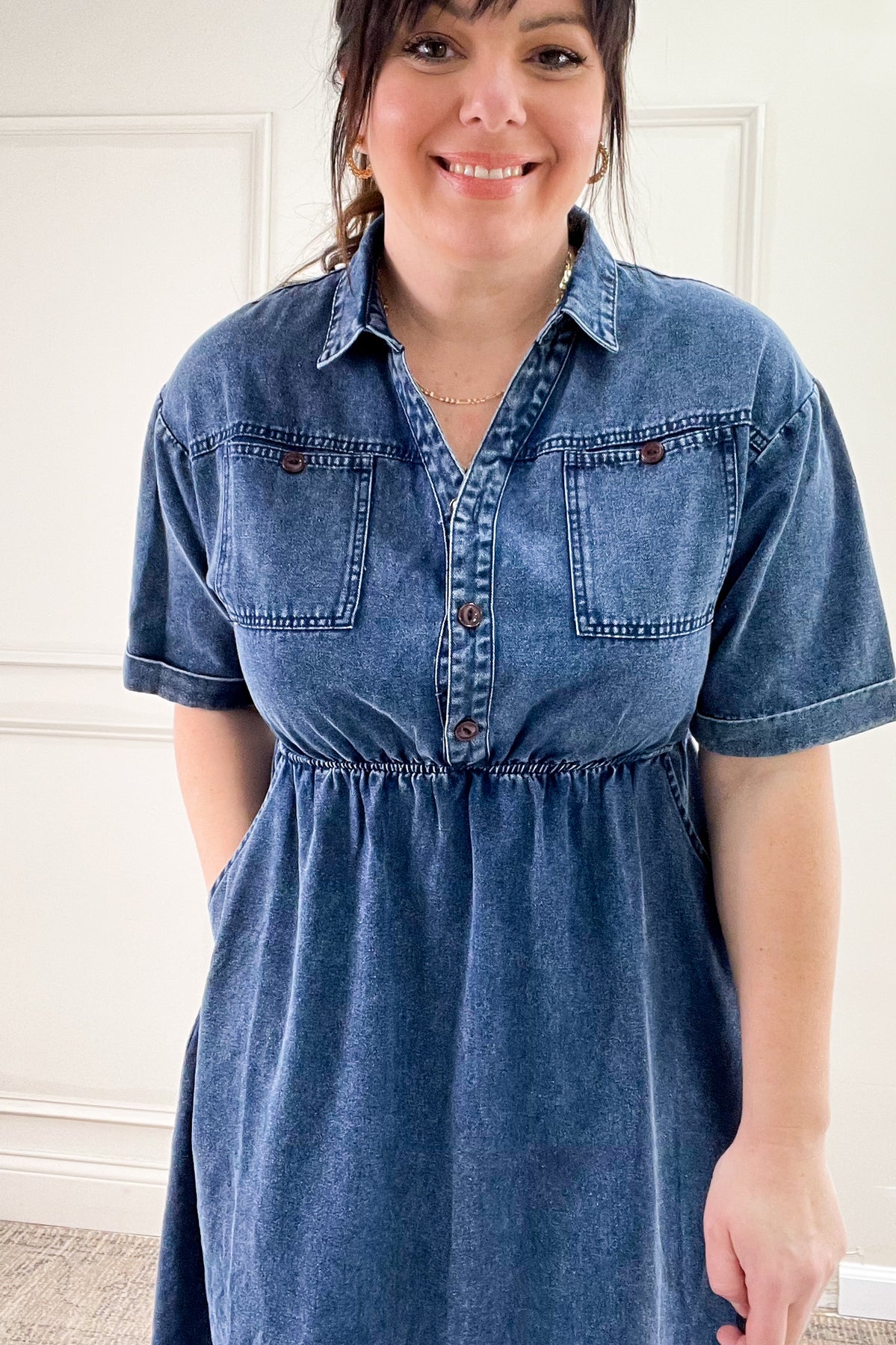 Meet your new go-to denim dress! This effortlessly cool midi dress features a soft, washed denim fabric with a relaxed silhouette that’s perfect for everyday wear. Designed with a collared neckline, button-up front, and short sleeves, it gives off a casual yet put-together vibe. The cinched waist adds a flattering touch, while the side pockets make it as functional as it is stylish.