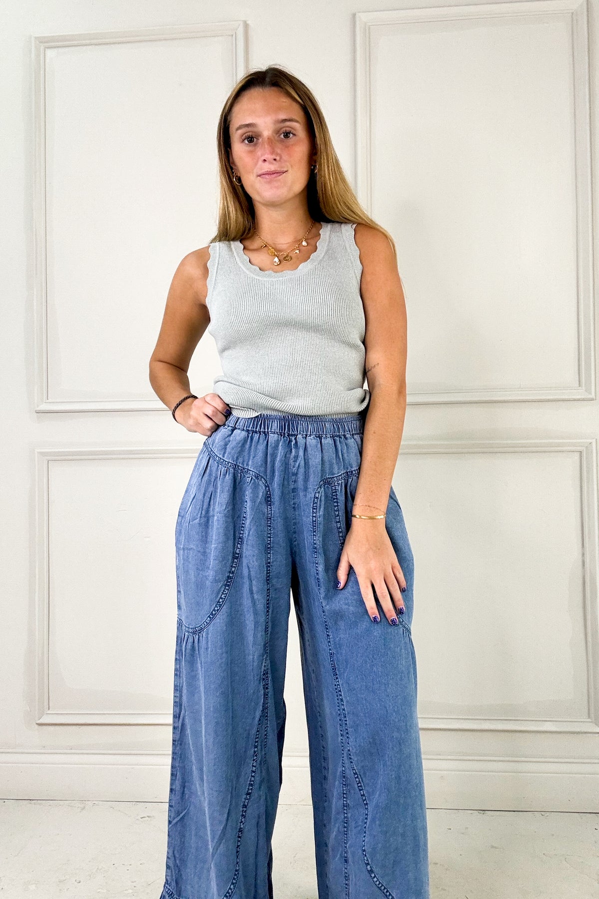 Easy, breezy, and effortlessly polished. These flowy wide leg pants are made from ultra-soft Tencel for a lightweight feel with a touch of drape. Featuring a comfortable elastic waistband and side pockets (yes, real ones!), they’re as functional as they are flattering. The darker denim-inspired hue makes them easy to dress up or down—pair with a tucked-in tee or a fitted tank for instant laid-back chic.