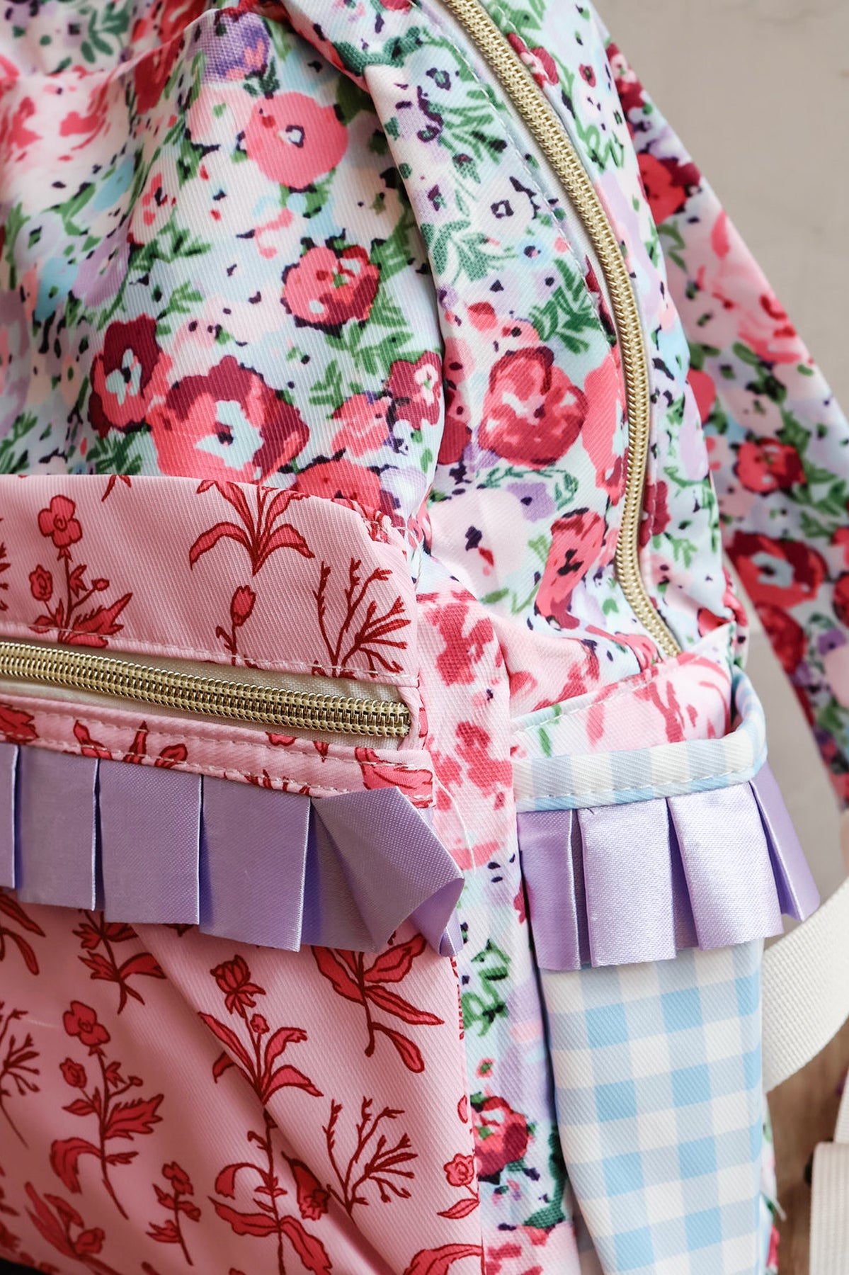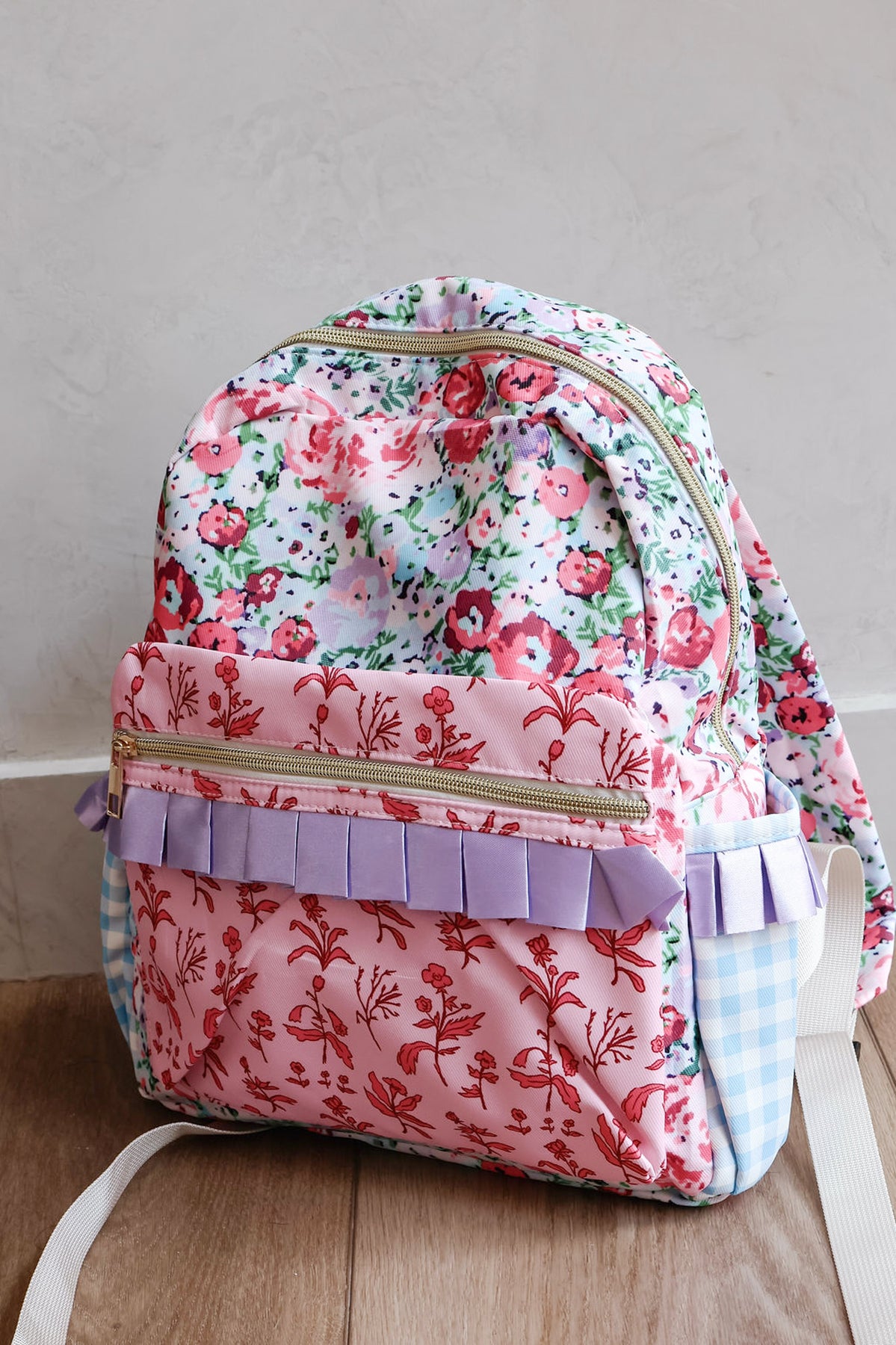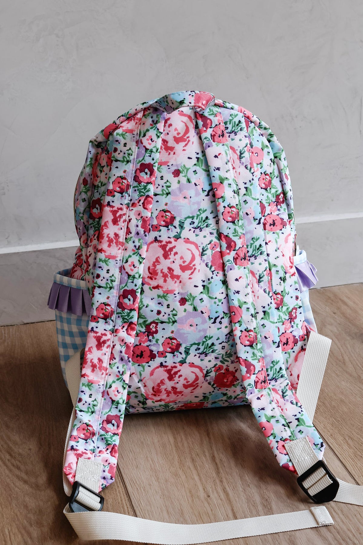 Bursting with color and charm! This multi-colored floral backpack is a blooming beauty, featuring bold florals, playful purple ruffle trim, and light blue checkered side pockets for an extra pop of fun. Perfect for the girl who loves all things bright, cheerful, and full of personality—whether she’s headed to school, camp, or a weekend adventure!