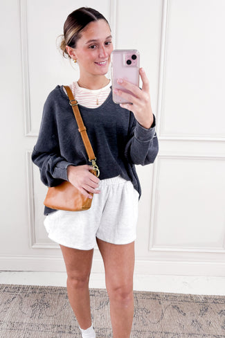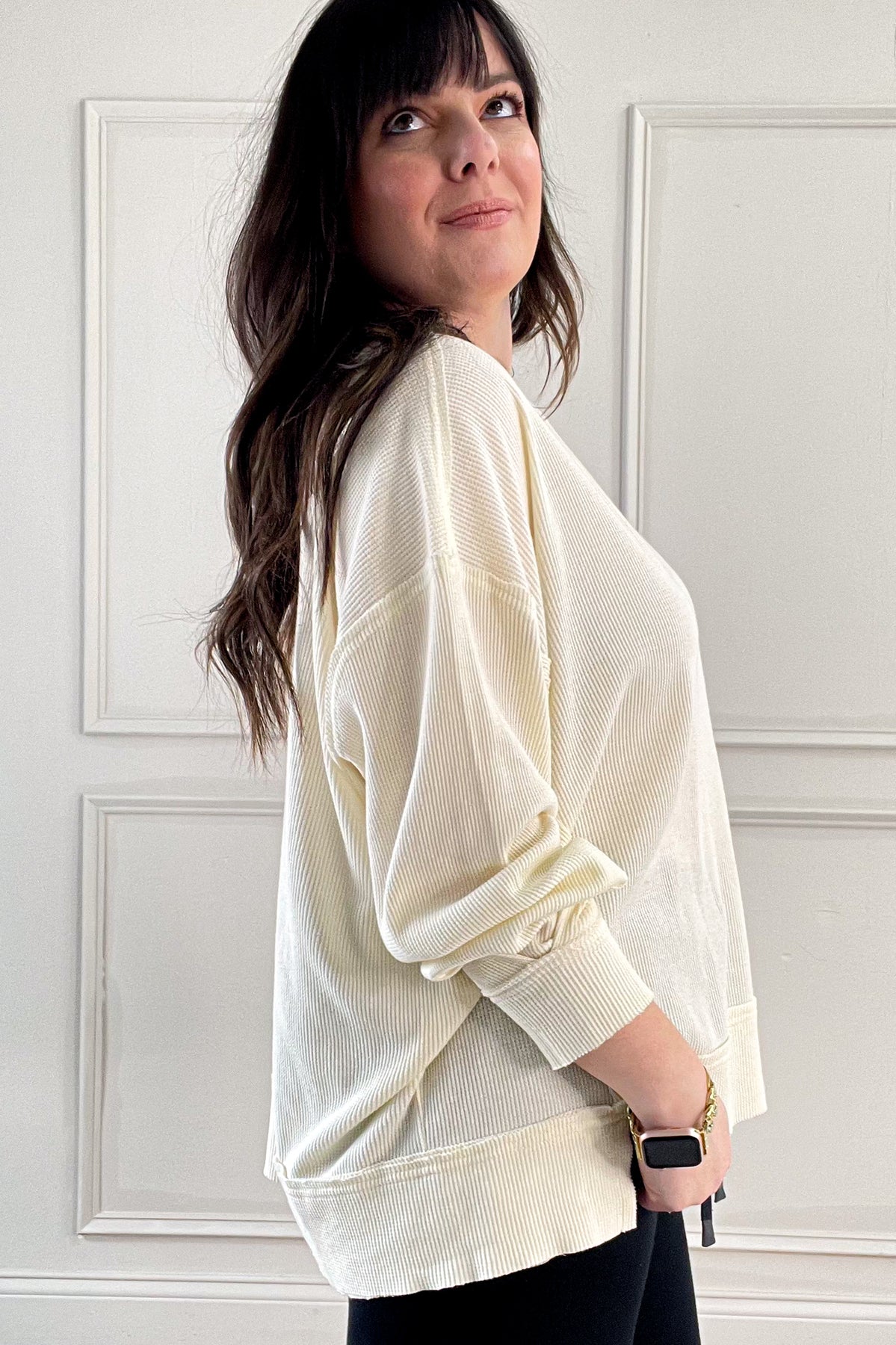 That perfectly worn-in feel you love! This waffle knit pullover features raw edges, inverted pleats, and an oversized fit for ultimate cozy vibes.