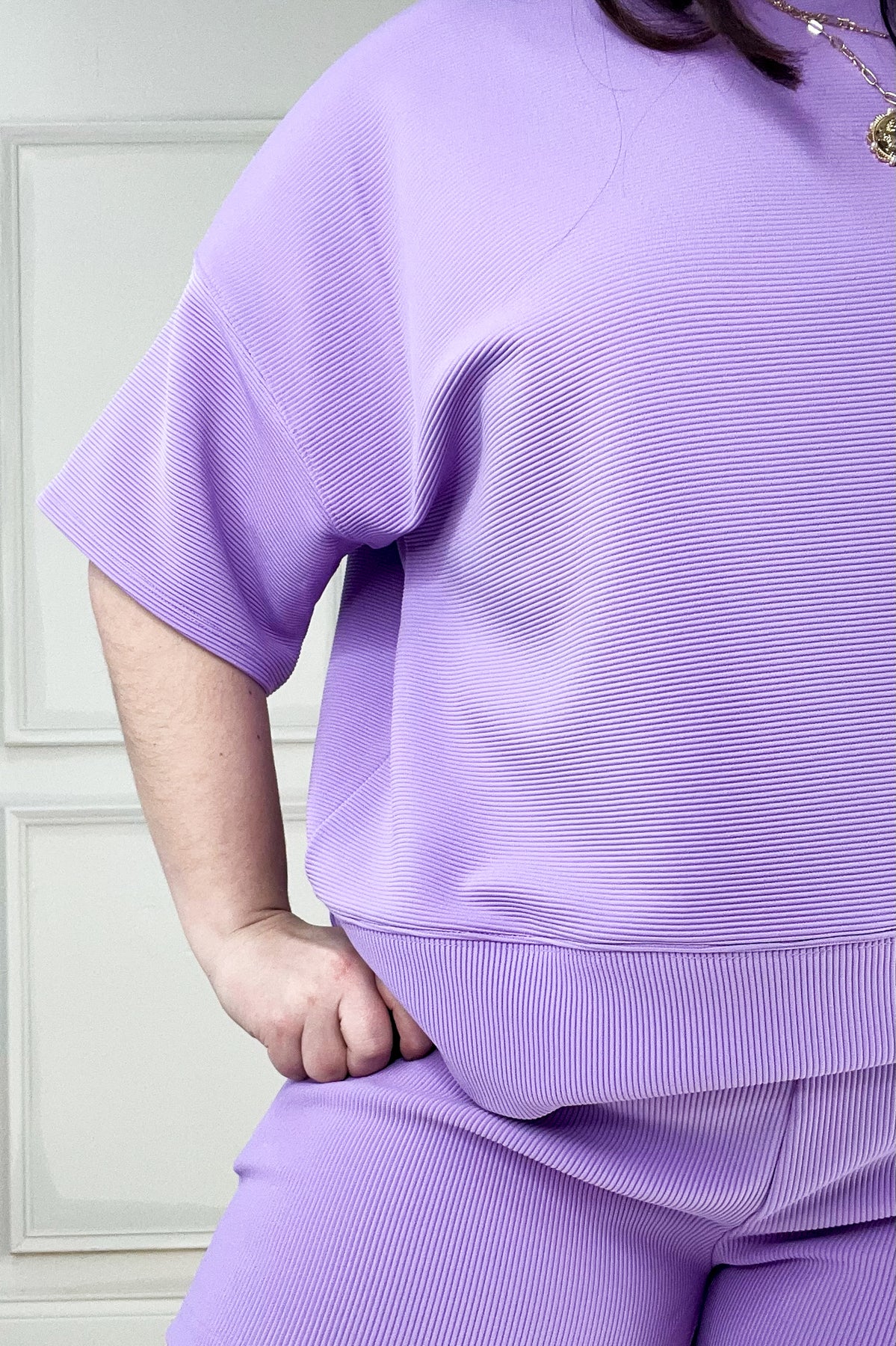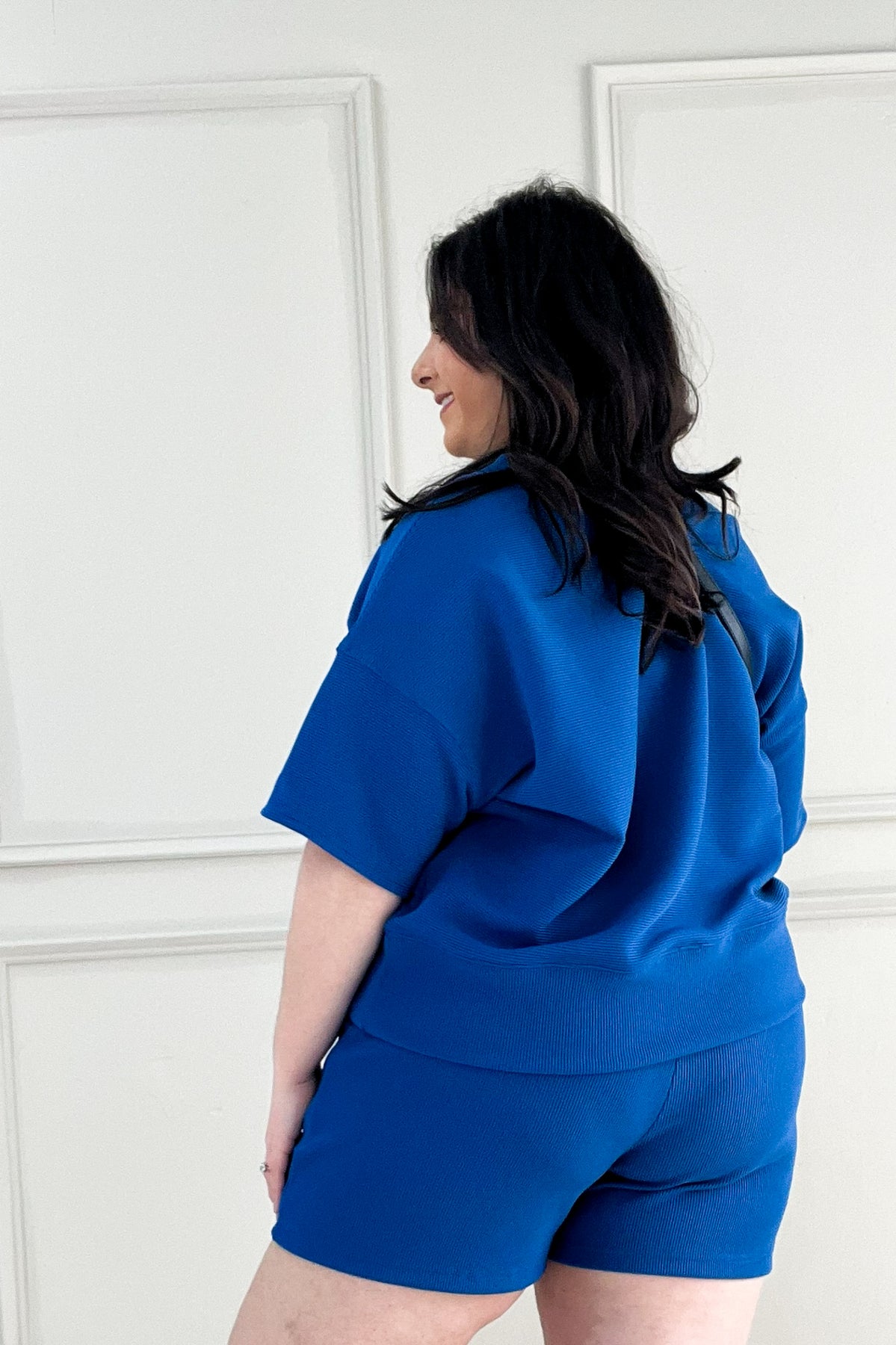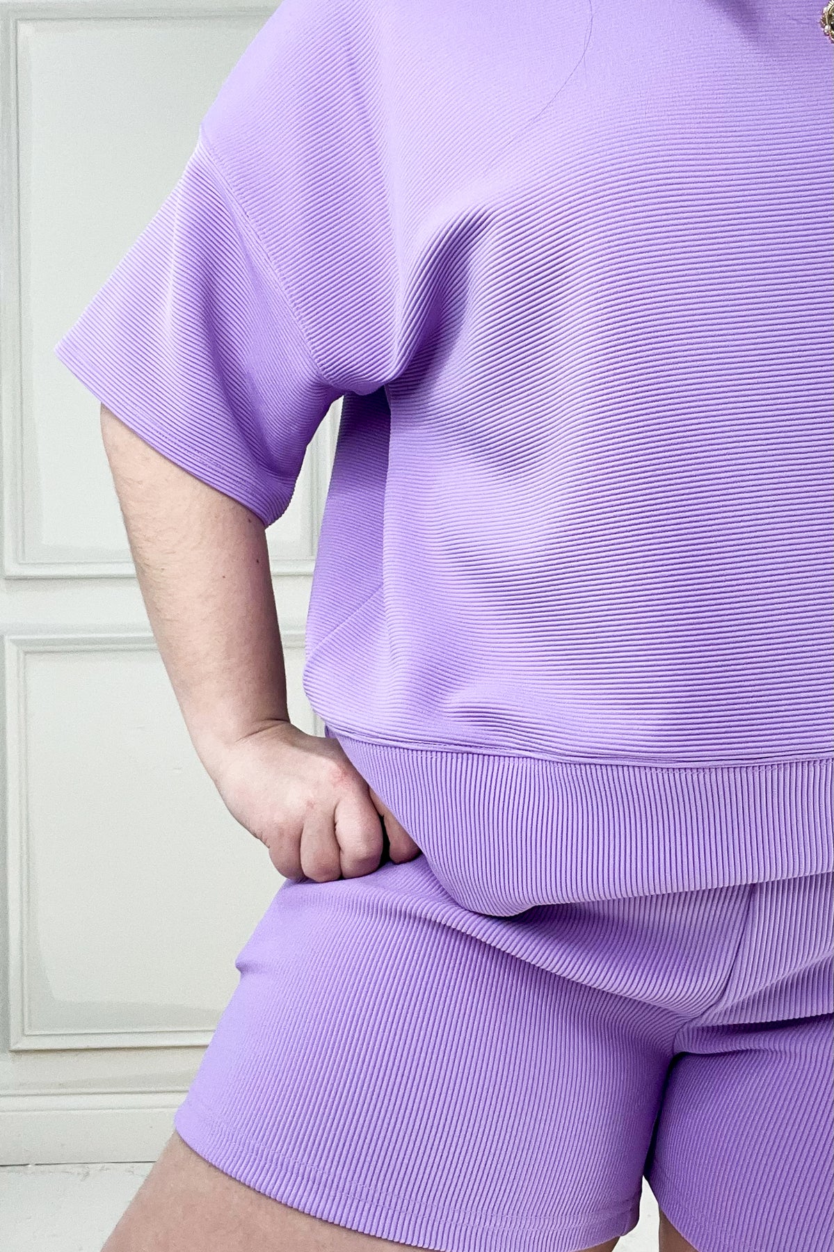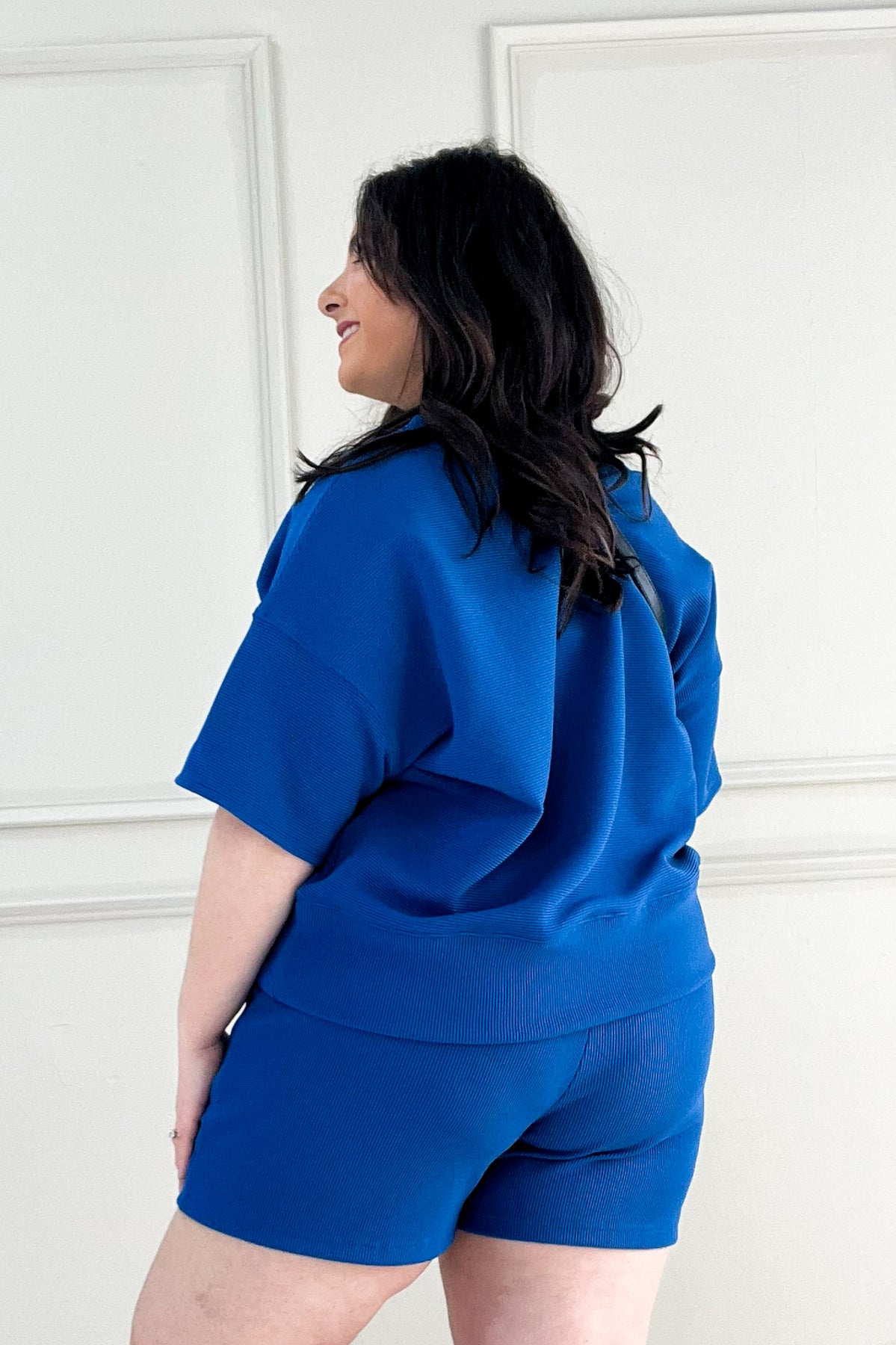 This oversized ribbed knit set is all about comfort. The drop shoulder top and elastic waist shorts make lounging look really good.