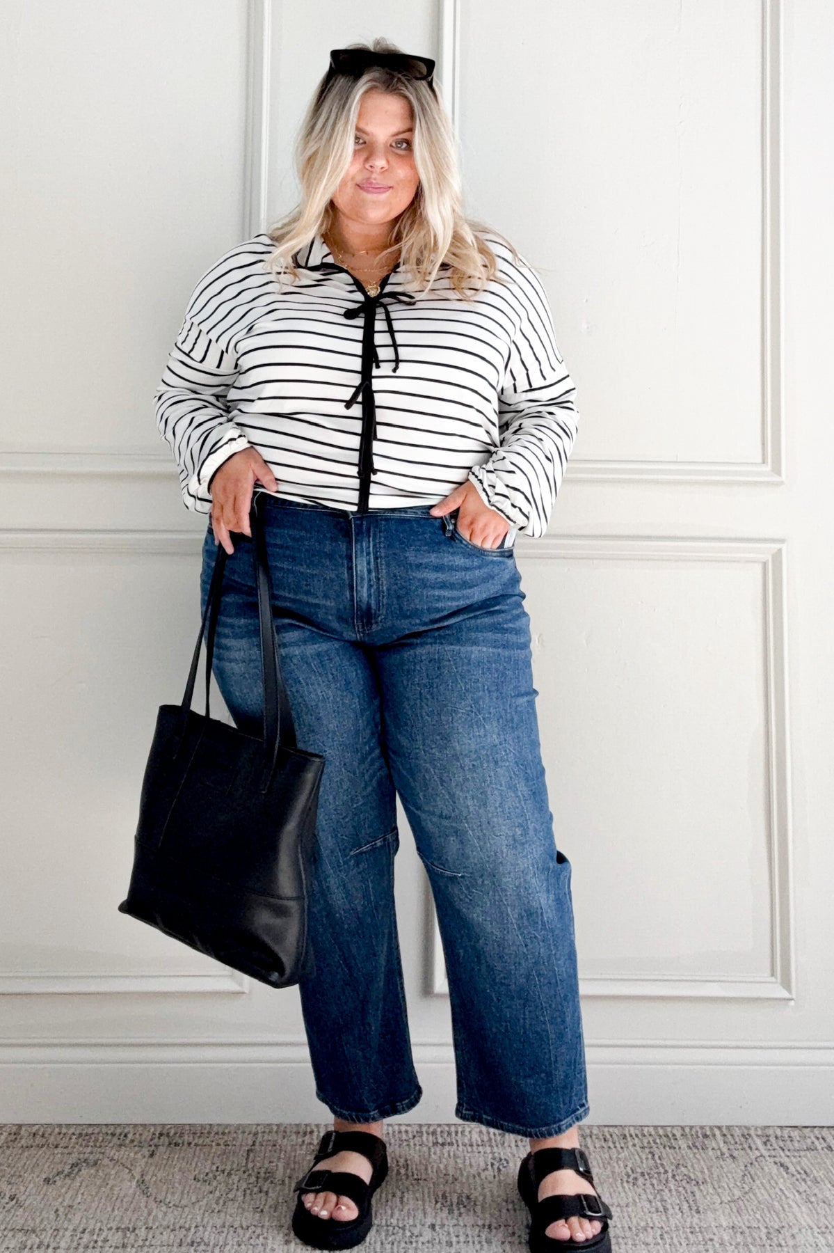 A little prep, a little whimsy! This striped top features contrast binding, bubble sleeves, and adorable ribbon bow ties down the front for a playful twist.