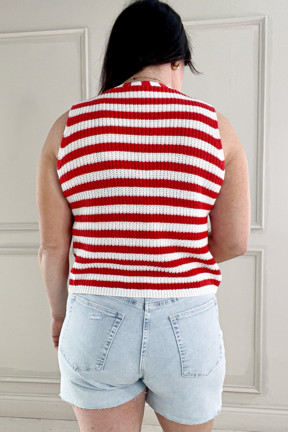 This sleeveless sweater vest features a bold stripe pattern and button front closure for a classic-meets-casual look. Layer it over a tee or wear it solo—either way, it's an easy win.