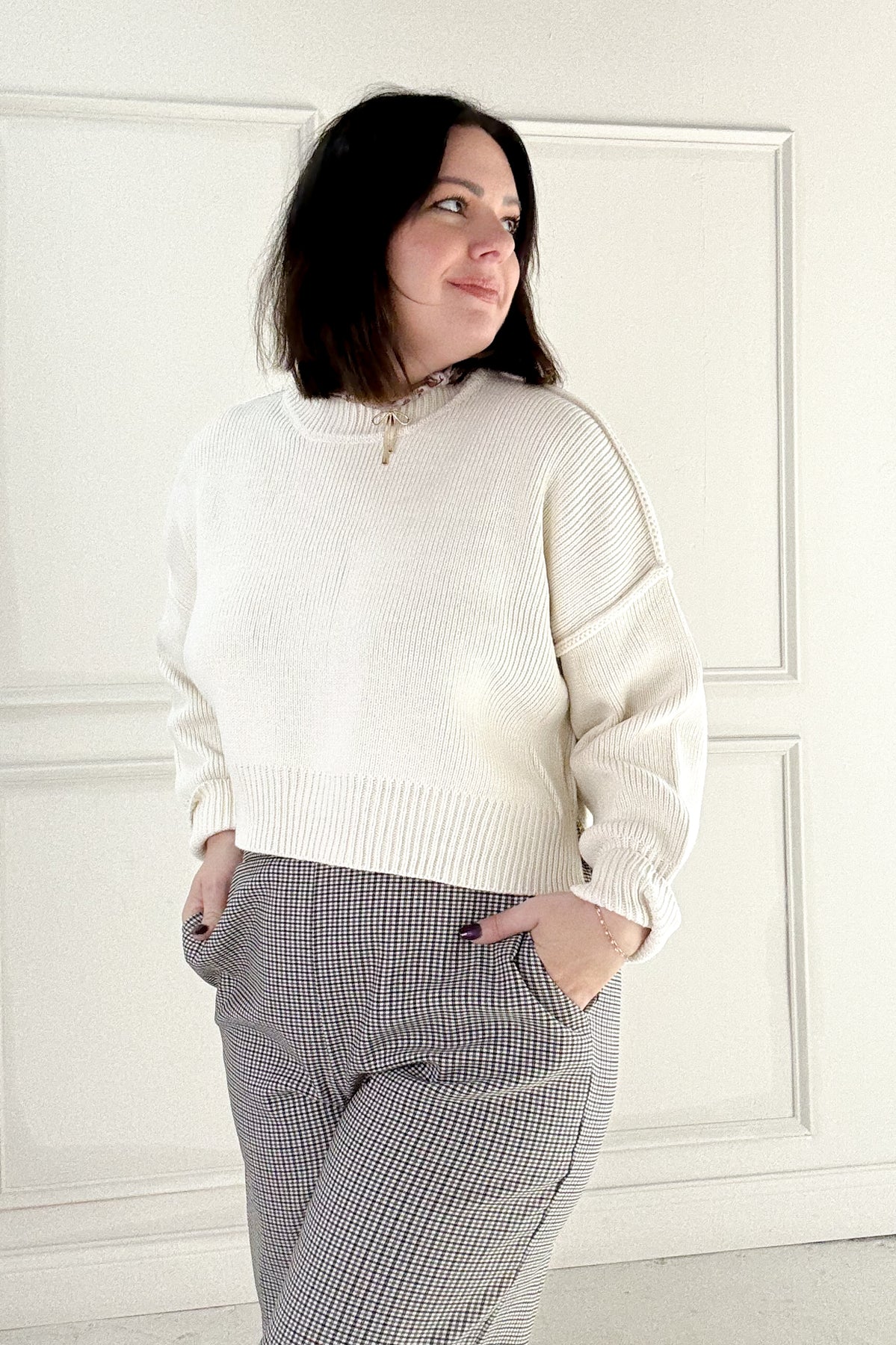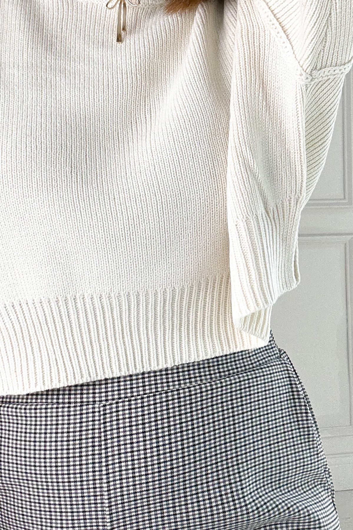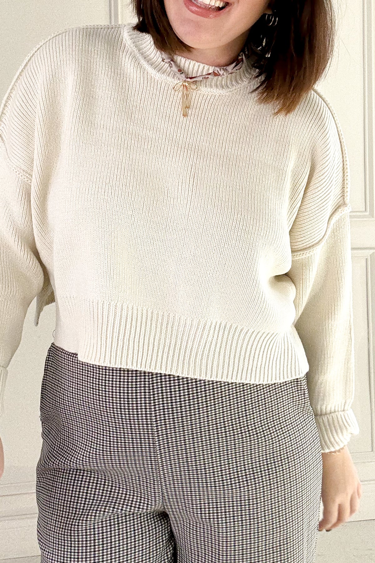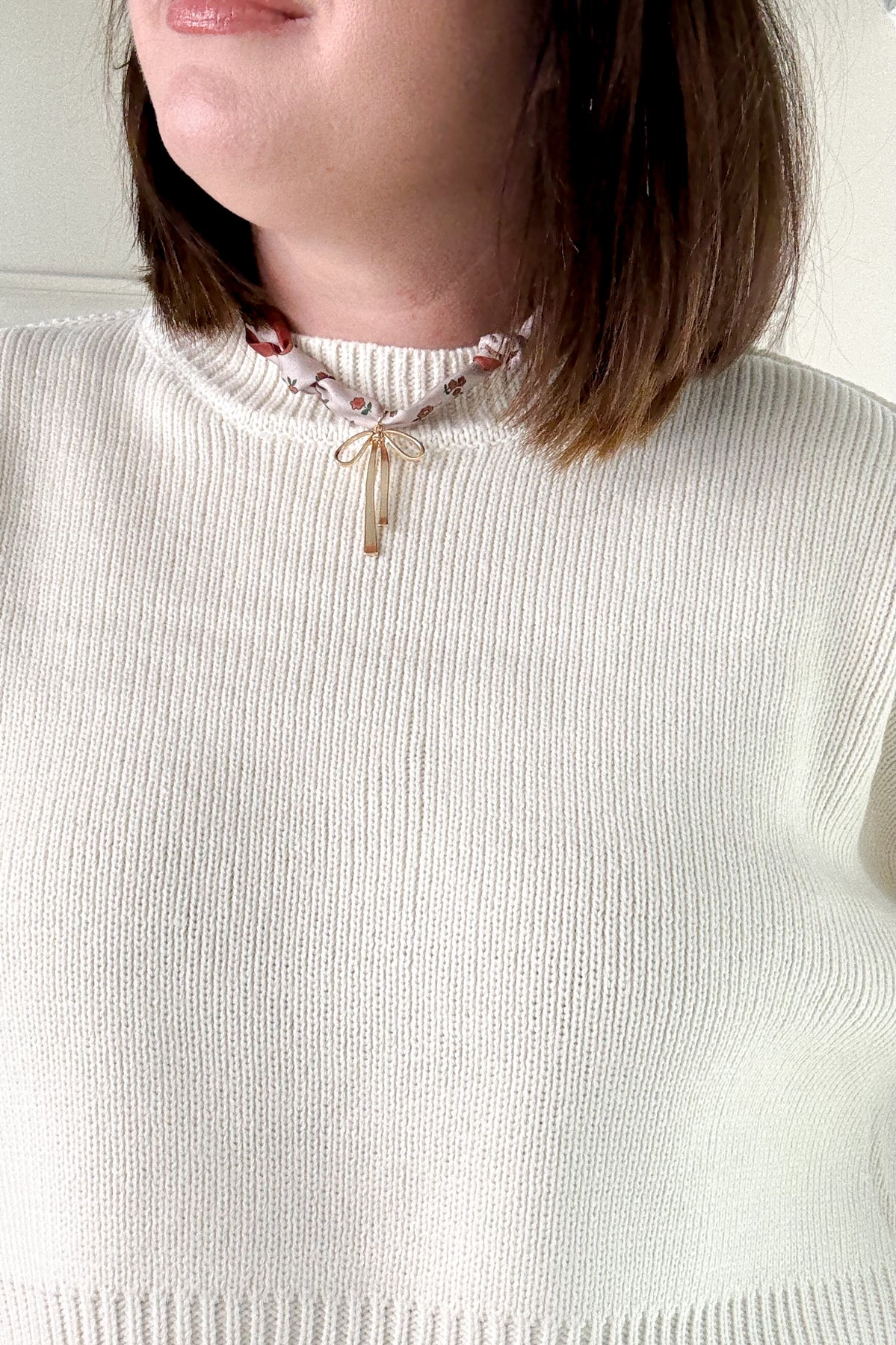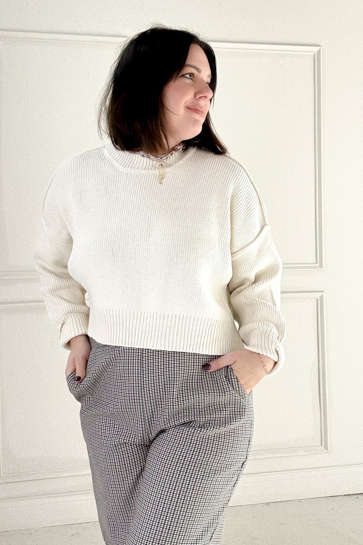 A classic white crew with a modern twist. This sweater is knit with chunky detailing for that cozy, lived-in feel while still looking fresh and timeless. Easy to pair with denim, skirts, or layered over a dress—your new grab-and-go favorite for every season.